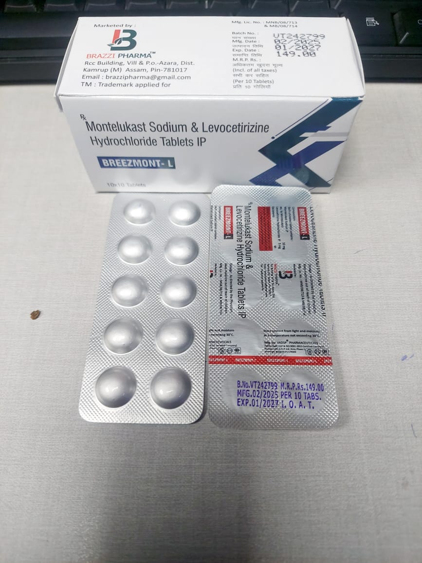 Breezmont-L is an effective anti-allergic medication combining Montelukast Sodium and Levocetirizine Hydrochloride. It is used for the treatment and prevention of allergic rhinitis, hay fever, and chronic urticaria (hives), as well as asthma symptoms.